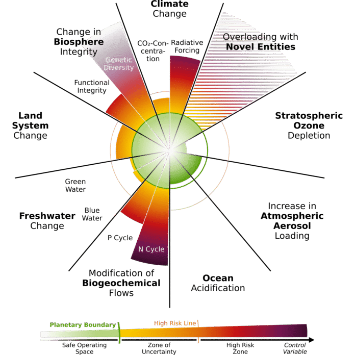 这意味着九条行星边界中有七项已被突破。全球顶尖的地球系统科学家指出,此前已被突破且仍在持续恶化的六项边界包括:气候变化、生物多样性、土地利用、淡水资源、生物地球化学循环(氮、磷)以及新型合成物质。